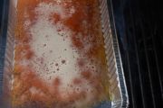 En øl blev hældt i en folie bakke og blev stillet ind i grillen, under stegen