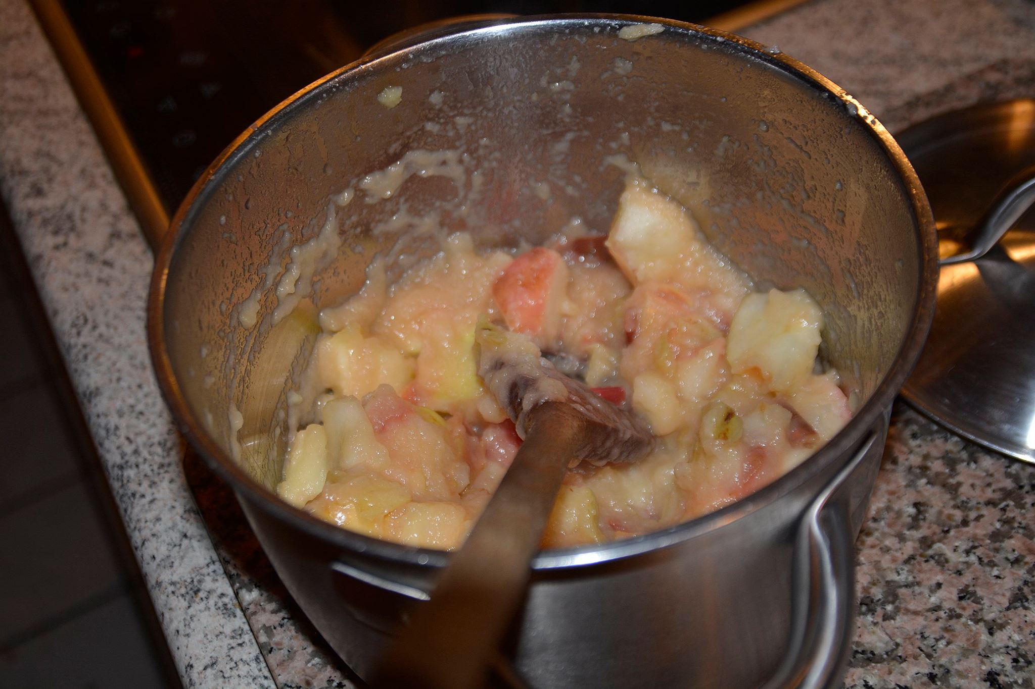 Når det er blevet varmt kommer du æblestykkerne i gryden, og rører om med jævne mellemrum.