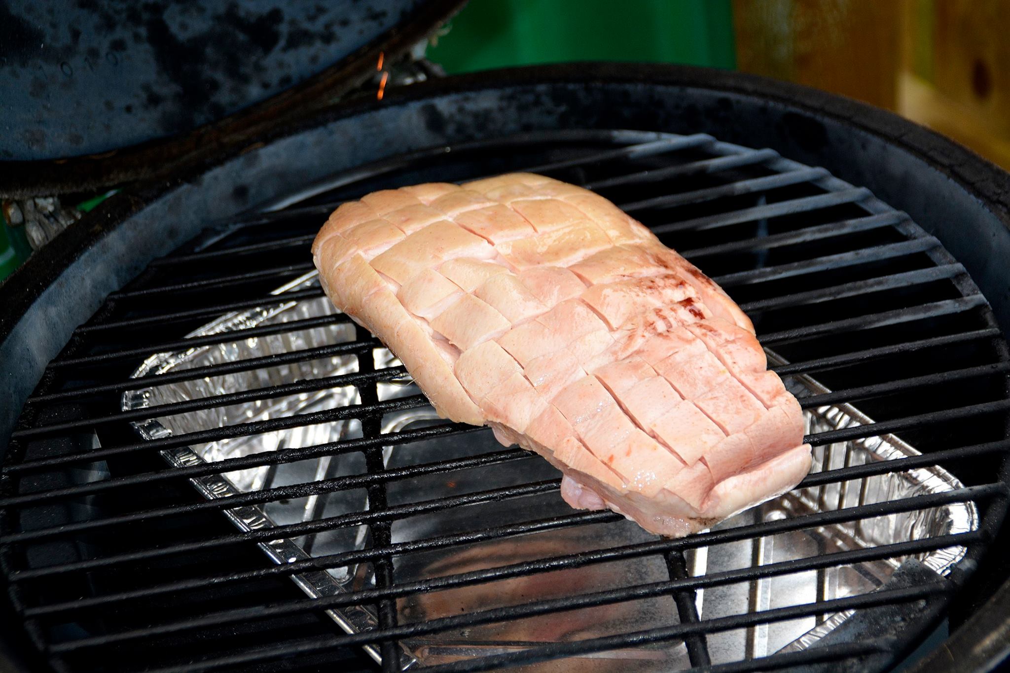 Først satte jeg grillen på indirekte varme ved 100 grader og satte en tom folie bakke under.