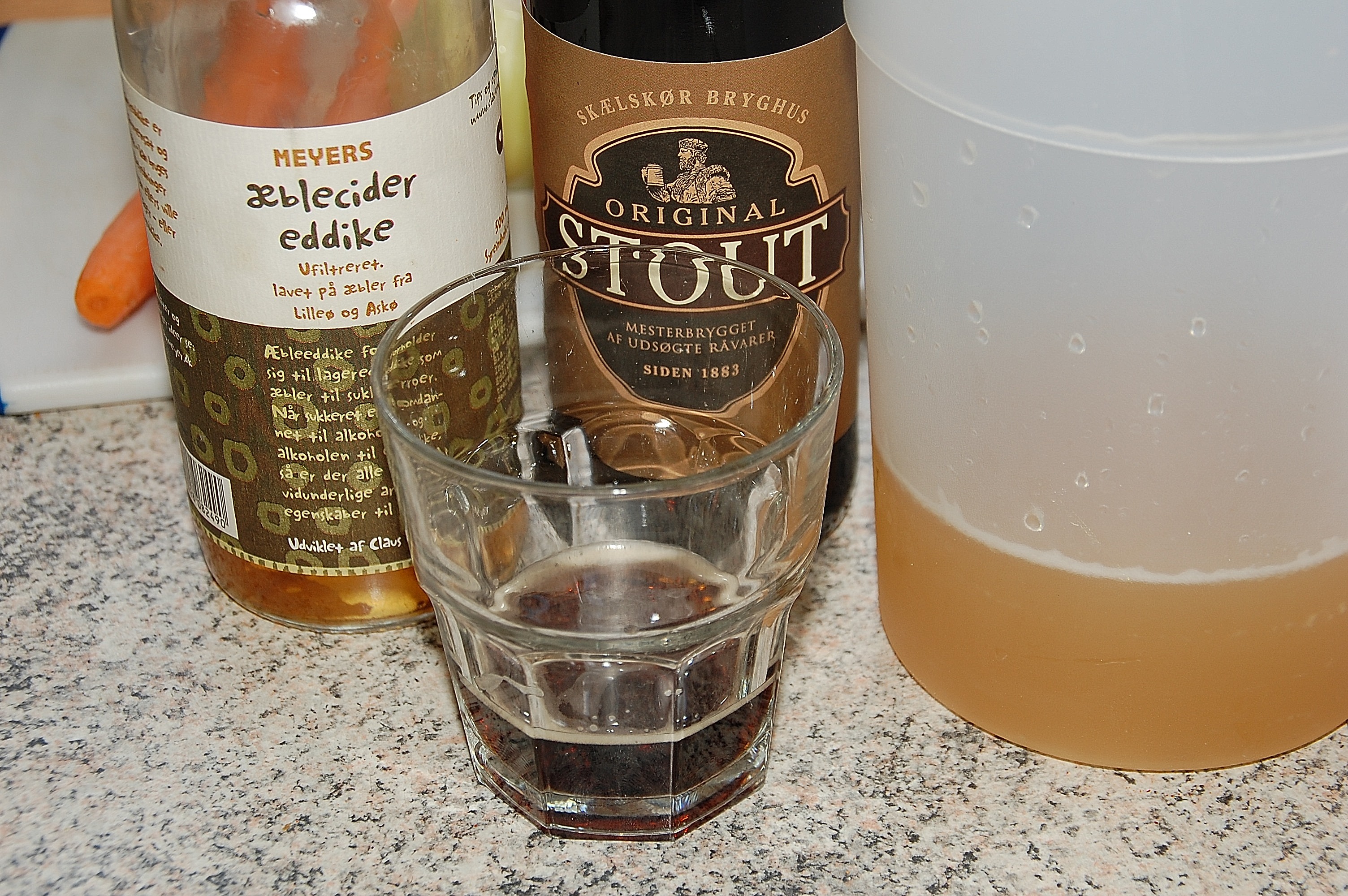 Efterfølgende blev stout, æblecider eddike, og æblemost hældt ved, og tomaterne kom i.
