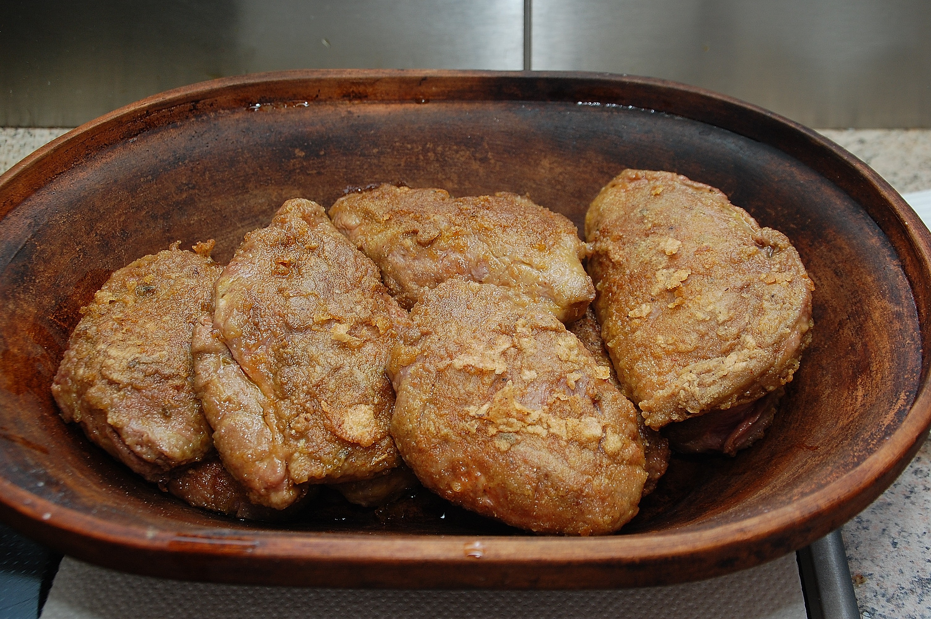 Og mel blev blandet med salt og peber og kæberne blev pudret og efterfølgende brunet af på panden, og lagt i römertopfen