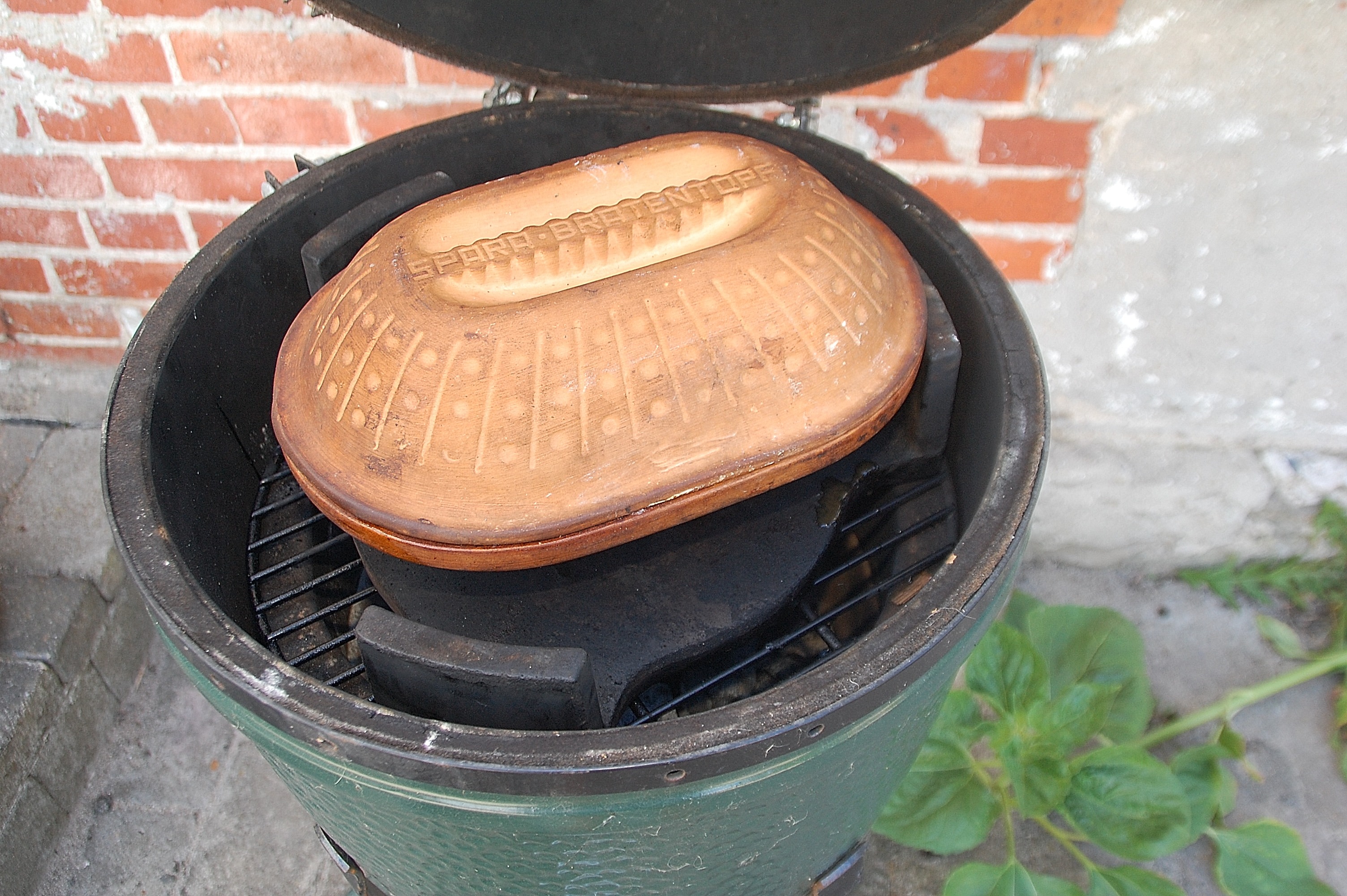 Ved at sætte risten nederst og sætte platsetter oven på kunne jeg sagtens have römertopfen i grillen på indirekte varme.