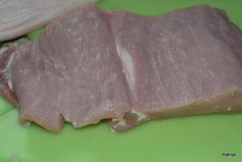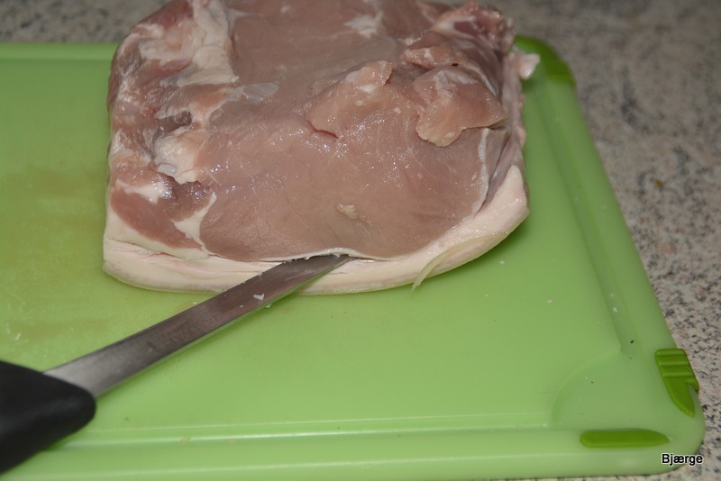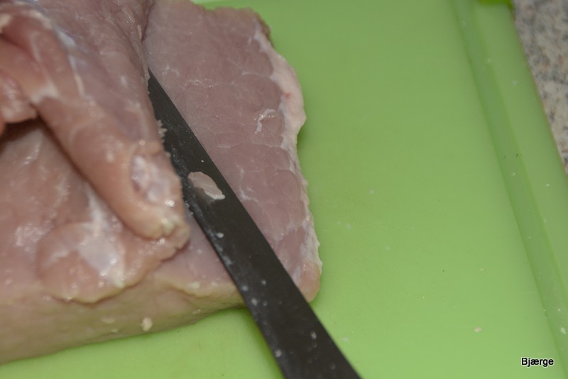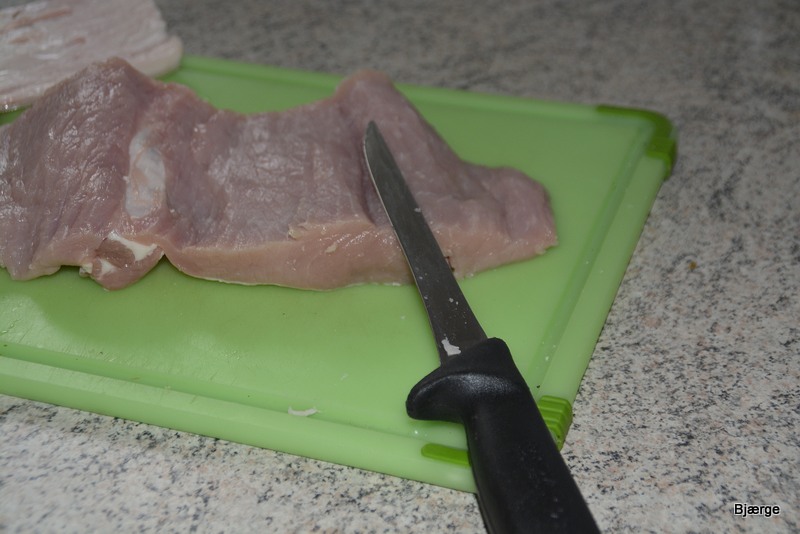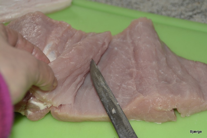 Skær derefter ind i kødet fra den ene side lad stykket være ca 2 cm tykt. Stop når du kommer ca 3 cm fra modsatte ende