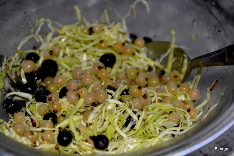 Den bestod bare af fint revet spidskål, hasselnødder i flager og lidt solbær og hvide ribs fra fryseren