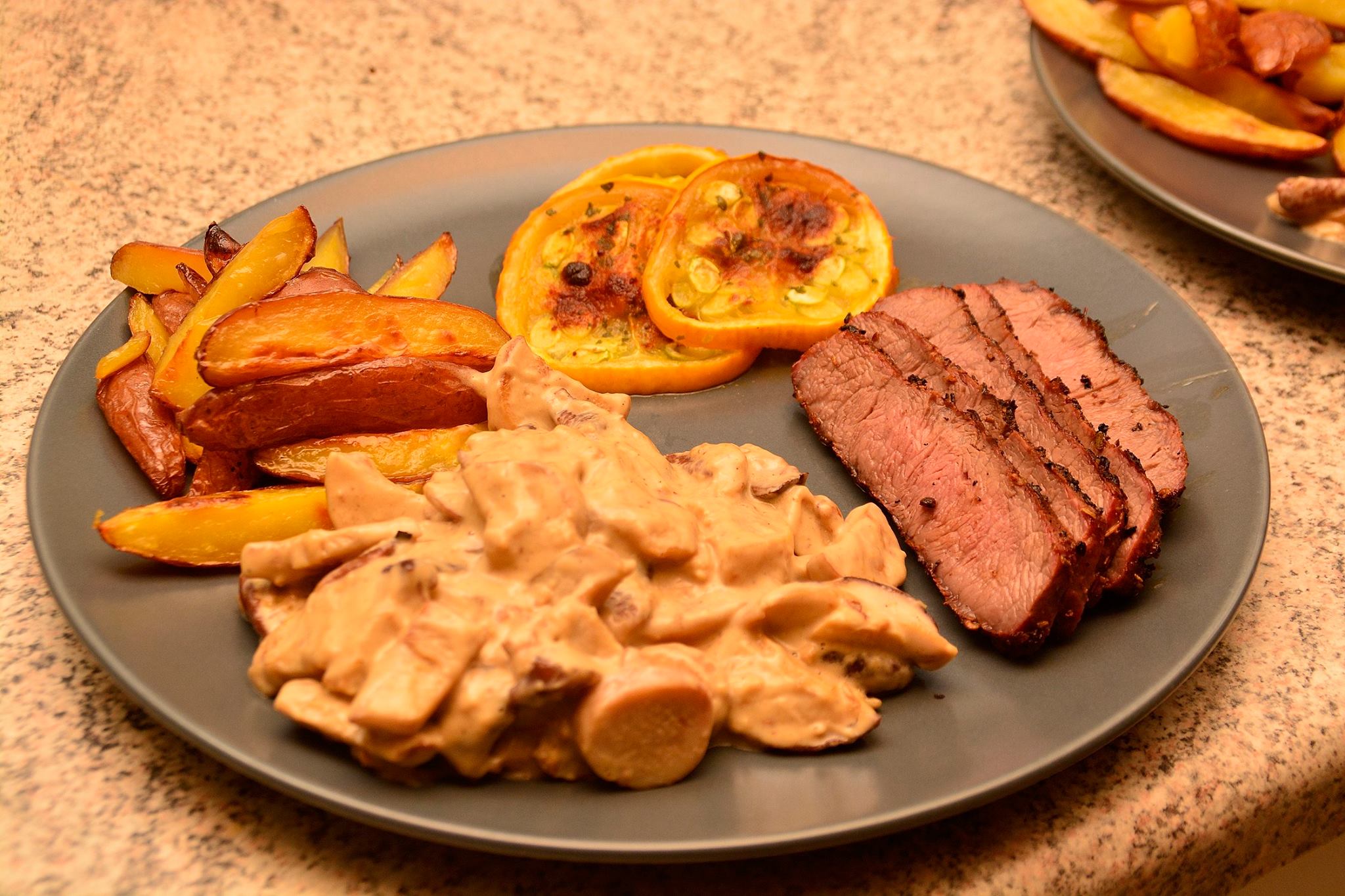 Flødestuvede svampe, råstegte kartofler, squash og det lækre kød
