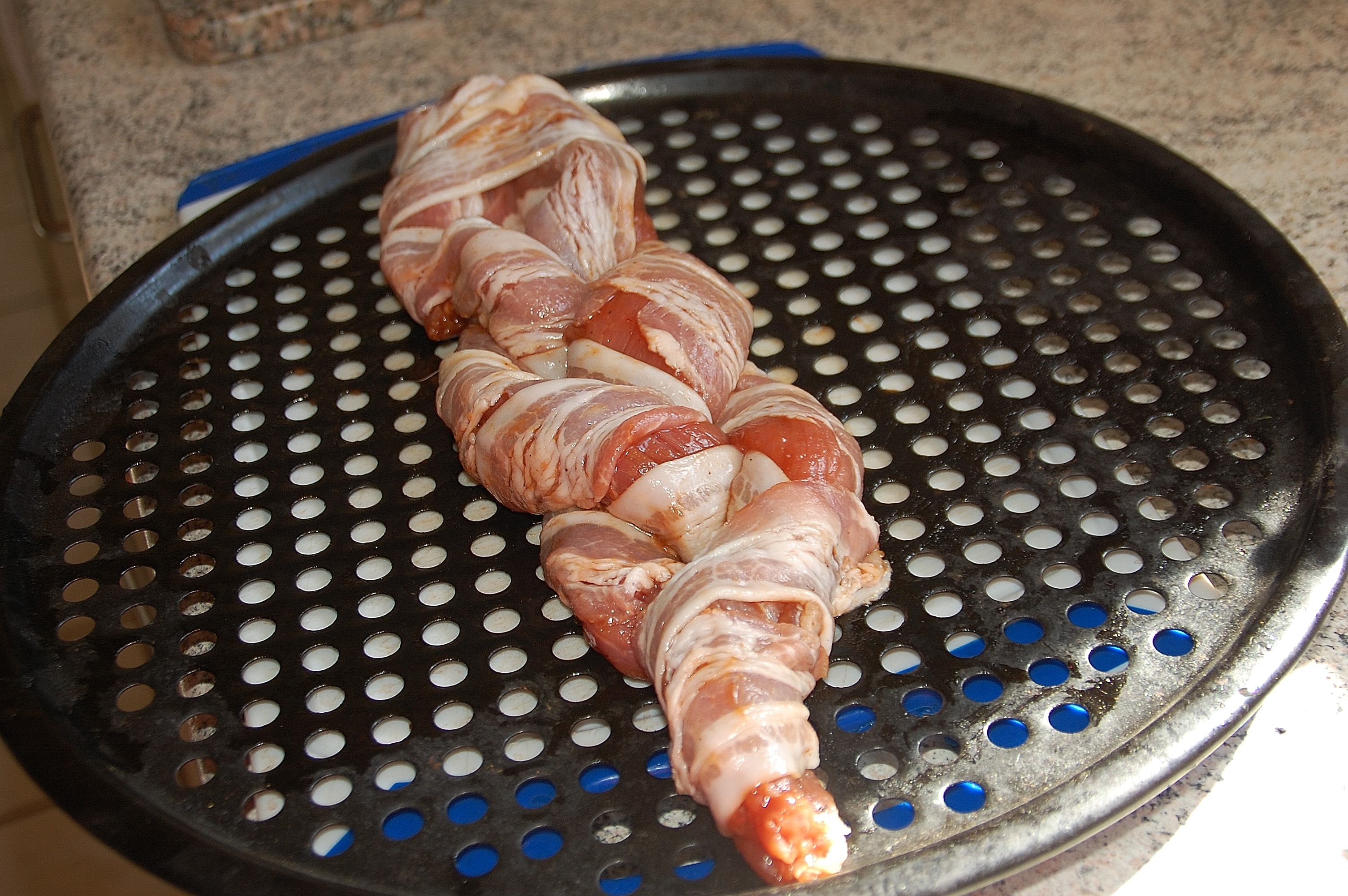 Ude af køleskabet igen,skulle blev mørbradens 3 fangearme omviklet med bacon. Jeg brugte 2 skiver bacon pr mørbrad “arm” og lod det nederste stykke være frit, så jeg til sidst kunne vikle en skive bacon omkring alle 3 “arme”, og få styr på kødet.