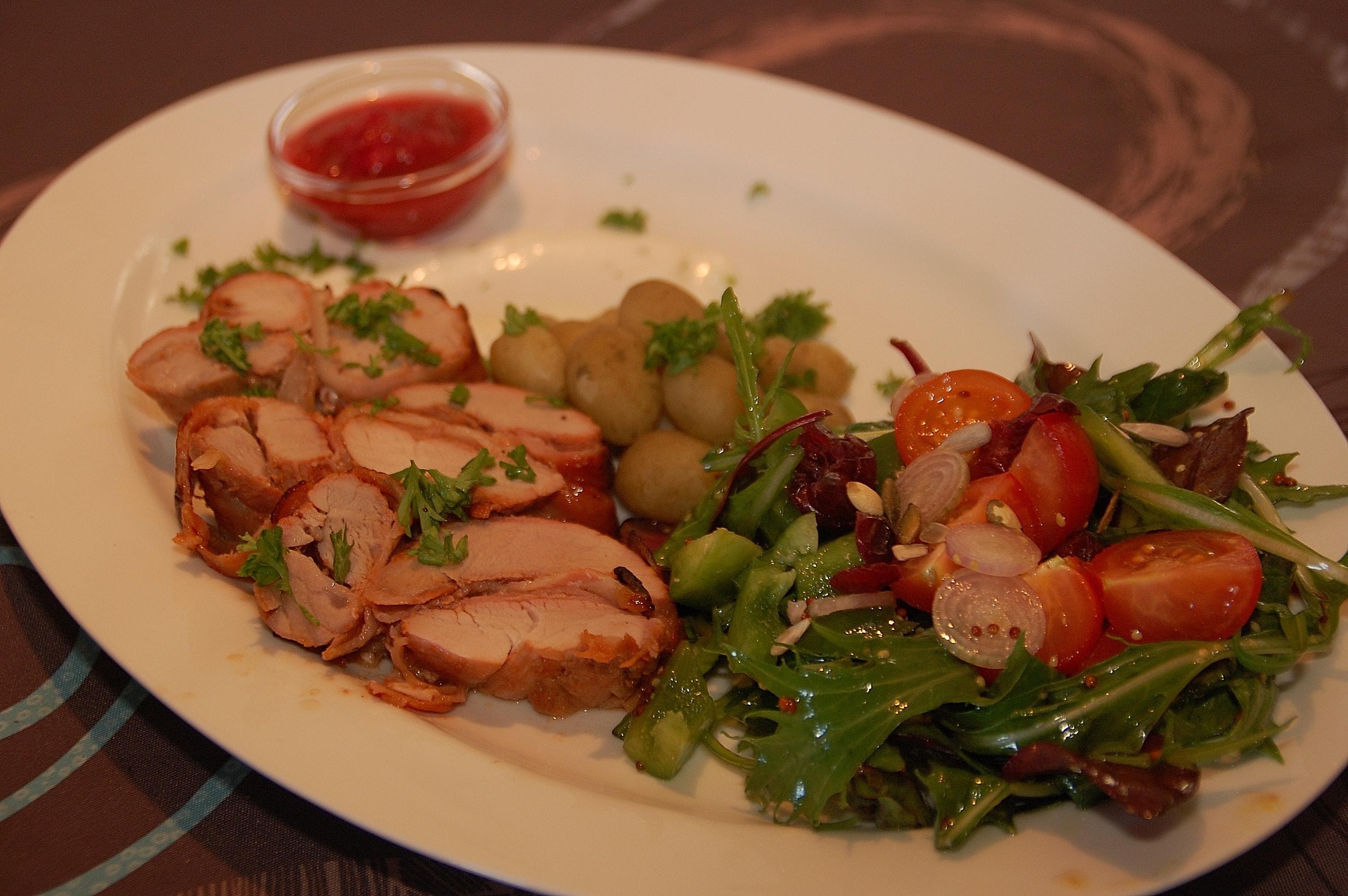 Flettet mørbrad med salat, nye kartofler, hvidløgs sauce og rabarber kompot