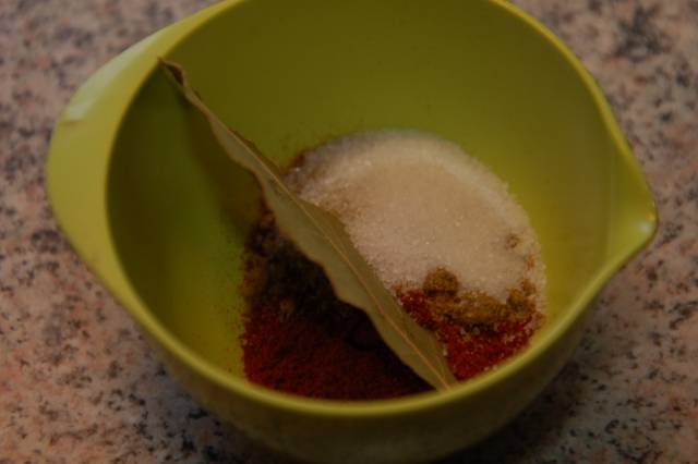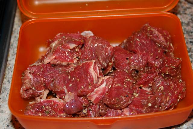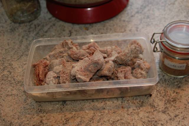 Rub det i nogle gode krydderier efter eget valg( kan undlades) og læg det i køleskabet i 4 timer inden du pudrer kødet.