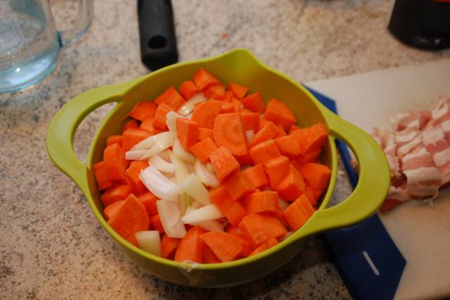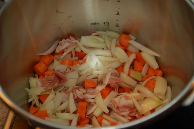 Kom derefter alle grøntsagerne og bacontern i gryden,og sauter dem uden at de begynder at få farve.