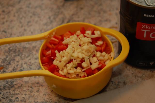 Hak snackpeber og hvidløg meget fint og vej krydderierne af