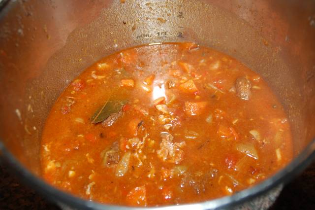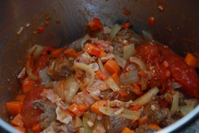 Når de er klar tilsættes kødet og fond/vand, tomatpurè, hakkede tomater samt krydderier.