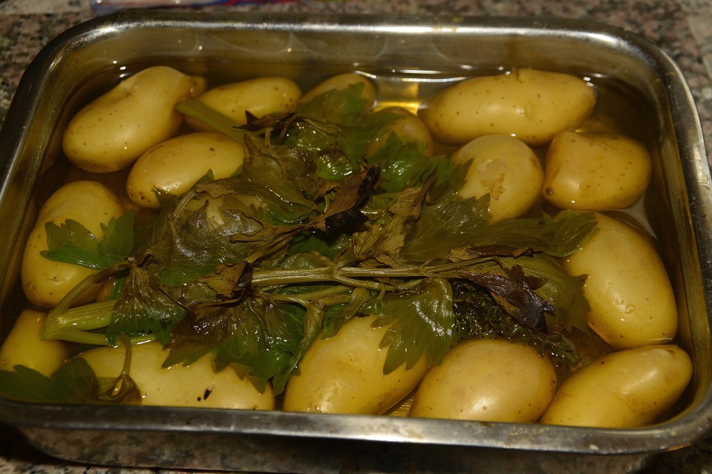 Igår blev de kogt med timian, løvstikke og lidt salt.