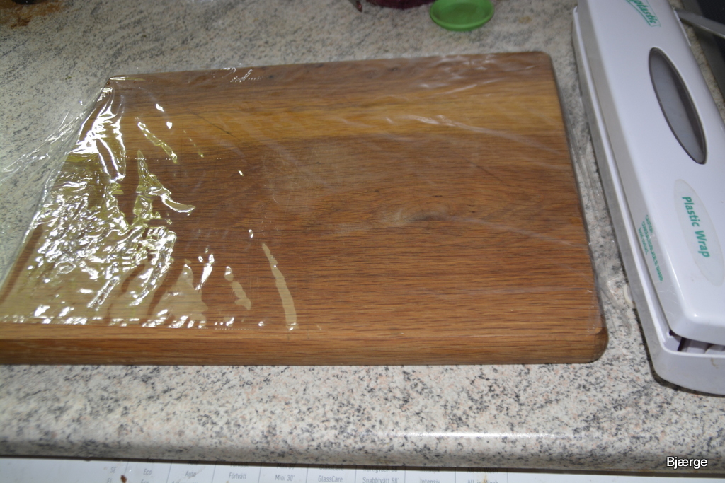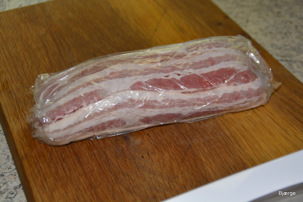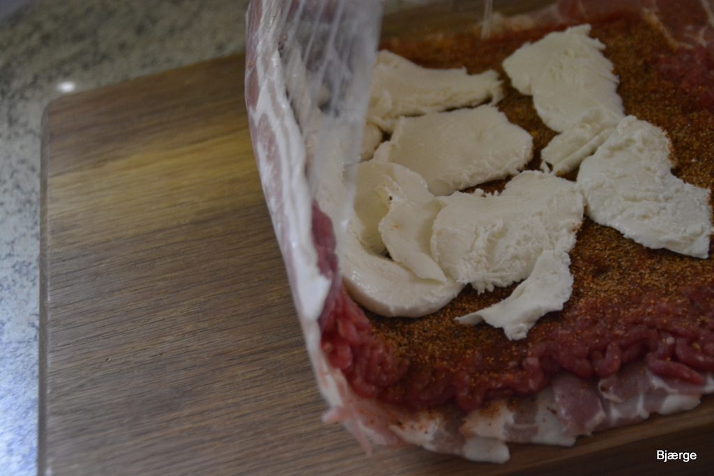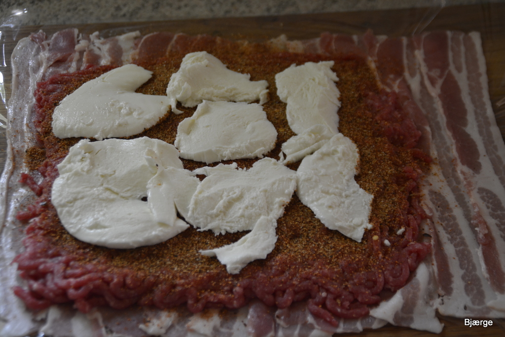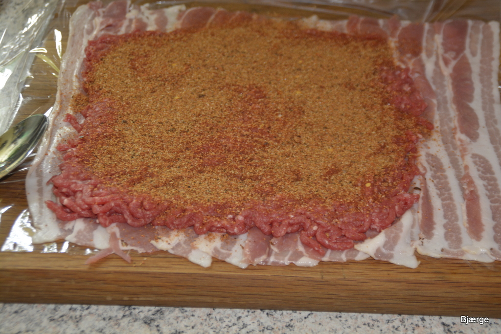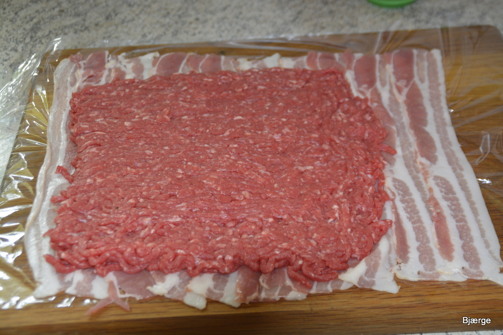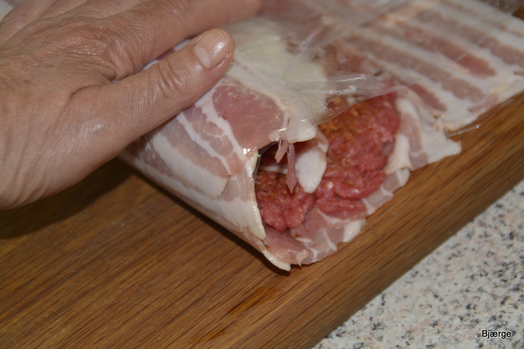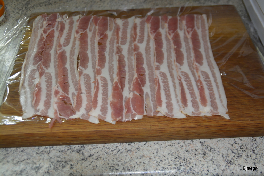 Læg derefter bacon på ( der skal være lidt mere end hvad dit kød kommer til at fylde, så du kan rulle kødet helt ind i bacon