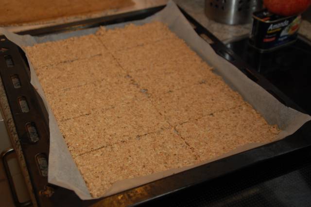 Del dejen med et snit gennem midten og derefter på tværs, så du ender op med 10 stykker knækbrød på en bage plade.