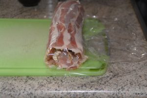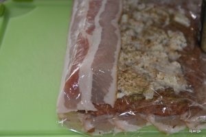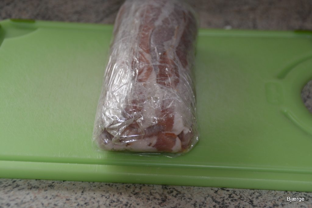 Mas kødet ud over på baconskiverne …sikre dig at du fri holder en god kant, så rullen bagefter kan rulles helt sammen