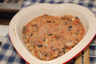 efterfulgt af en rest hakkede oliven                        og de hakkede tomater og madlavningsfløden