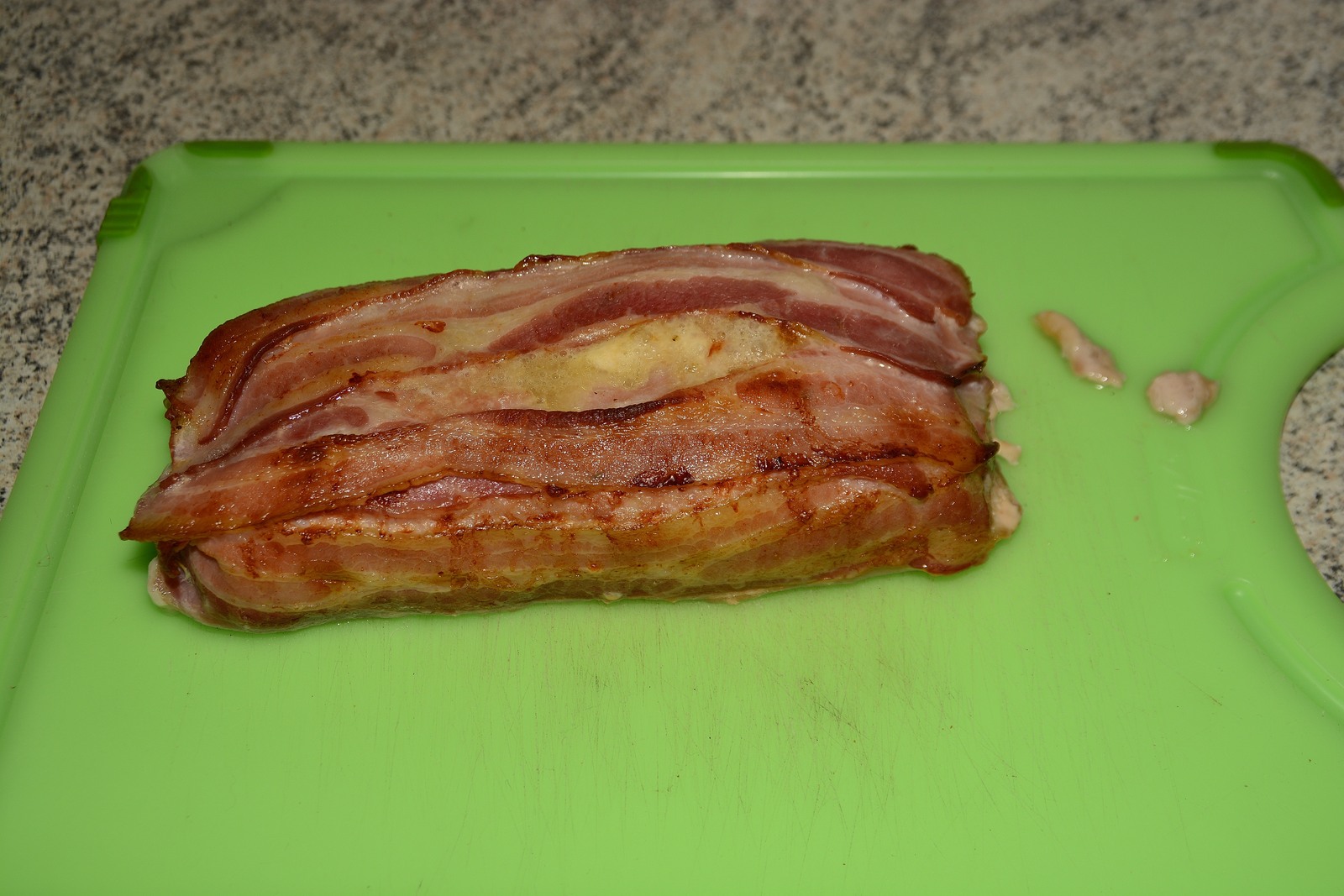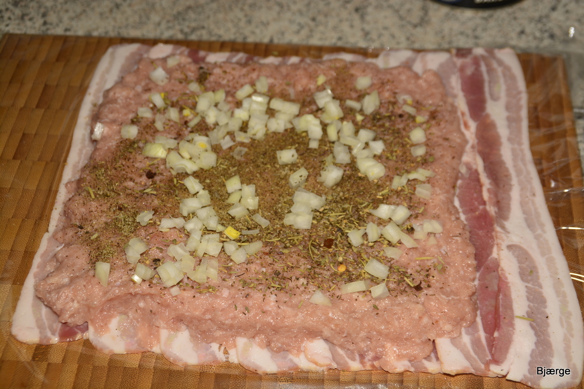 Den nemmeste måde at få et godt resultat er ved at starte med at ligge husholdningsfilm på bordet, og læg bacon skiverne sådan (jeg ligger altid sidste stykke omvendt)