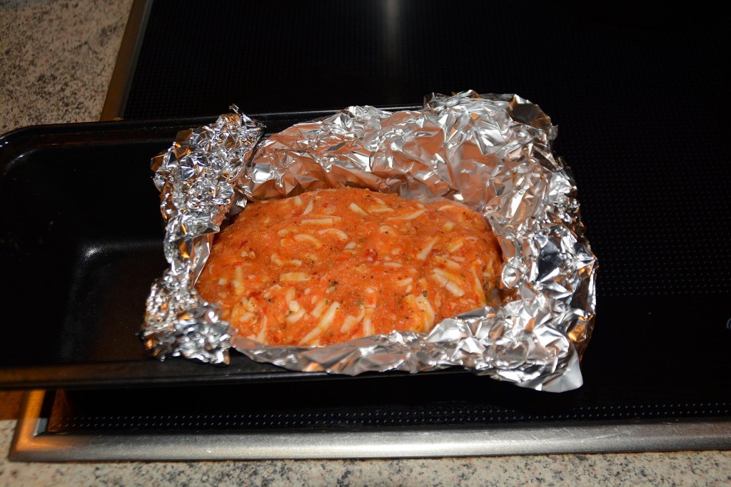 Det hakkede kød blev placeret oven på, og lagt i enden af en lille form, med folie omkring