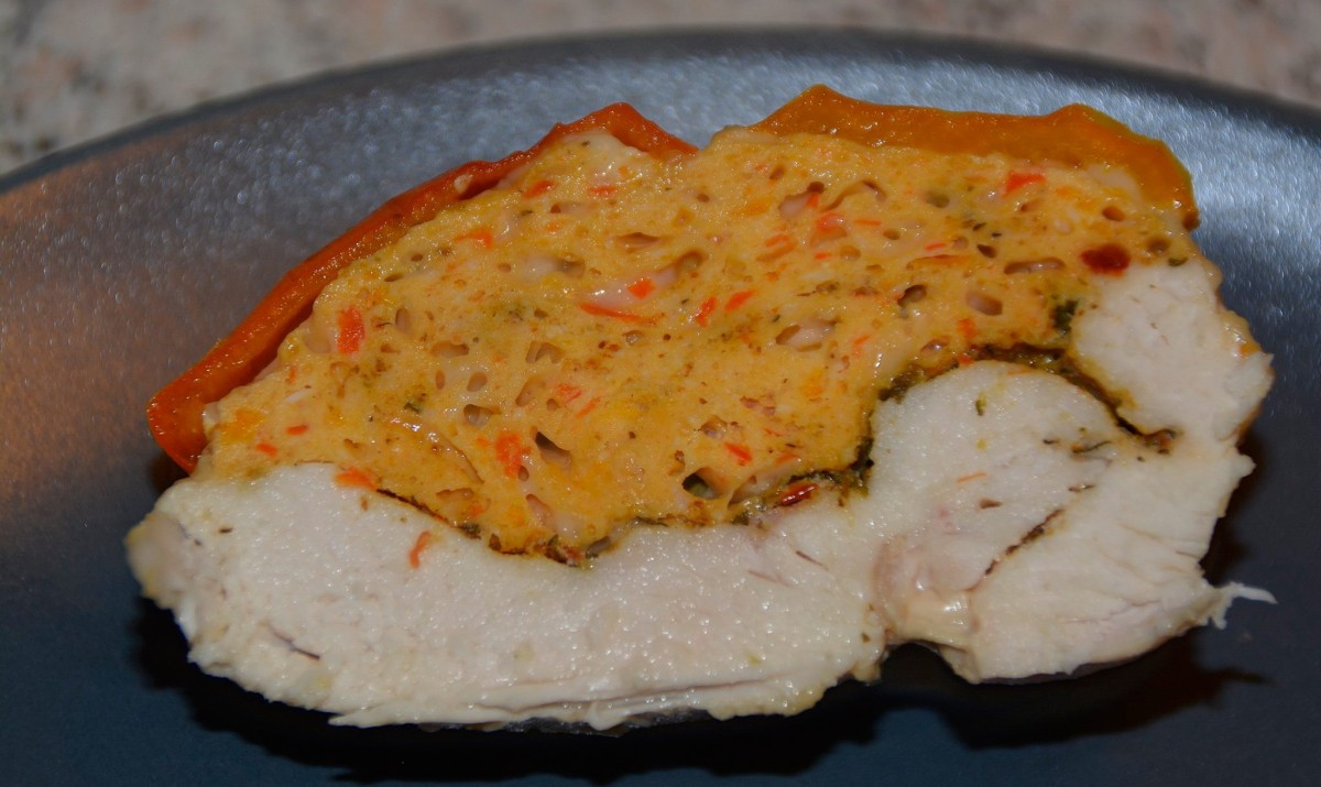 Det andet kyllingbryst blev hakket til ukendelighed, sammen med en mini gul og rød peber.