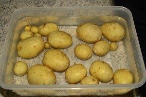 De første kartofler blev gravet op og lagt i en foliebakke med citrontimian og salt og vand