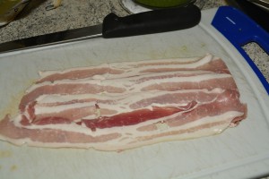 4 skiver bacon lagt på brættet, og brystet skåret sådan uden at skære det helt igennem