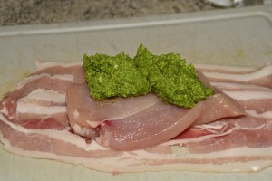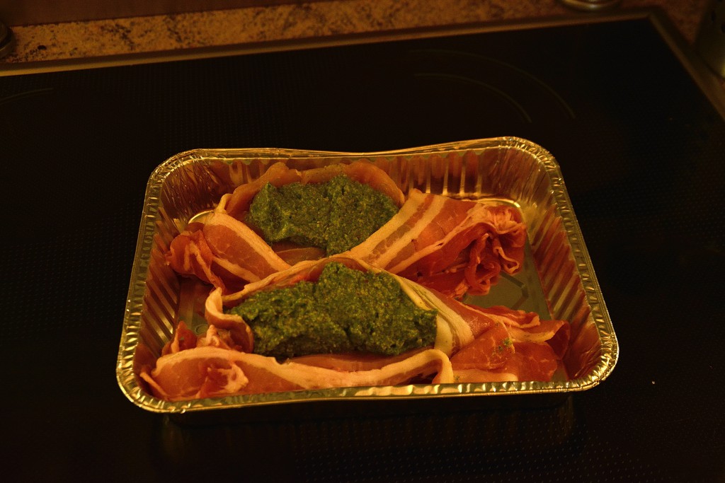 Lagt på bacon skiverne, med en stor klat persillepesto