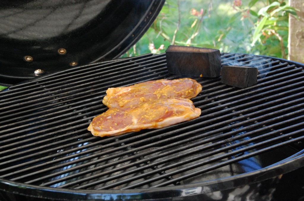 Jeg valgte at bruge gaskuglegrillen, og tragten blev vendt til direkte varme, og et par røgklodser kom på, og temperaturen blev sat til fuldt skrue.