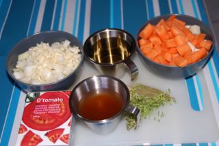 Skræl gulerødderne og de andre grøntsager, og skær dem i mundrette bidder.