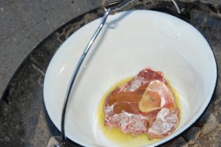 Da bunden i gryden ikke er så stor, skal man brune kødet af over nogle omgange.