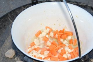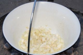 Dernæst kommes løg og hvidløg i gryden og svitses til de er gyldne.