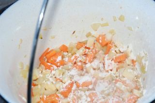 Så strøer jeg lidt ekstra mel ( ca 1 spsk ) ud over grøntsagerne og rører rundt, det giver en lidt tykkere sovs