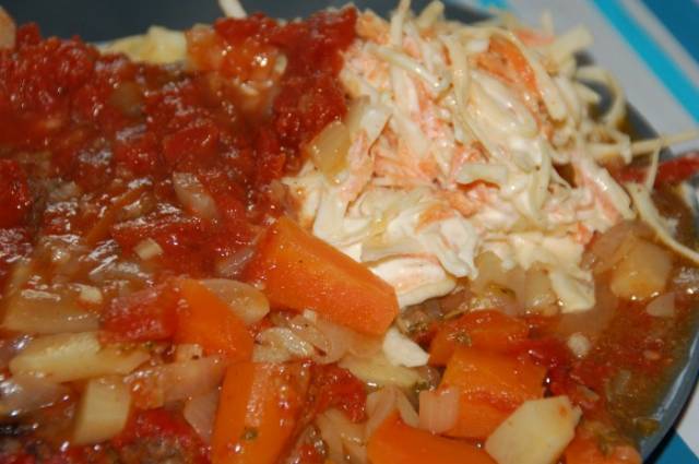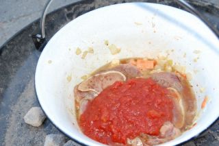 Tilsæt hvidvin, bouillon og de hakkede tomater.