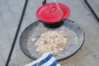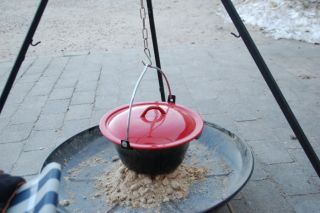 Desuden skal man lige huske, at træ/briketter synker sammen, så man må påregne at skulle sænke gryden undervejs , for fortsat at holde gryden i kog.