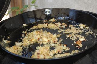 Hæld olien på panden og det hakkede løg svitses, uden at blive brunt