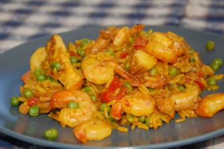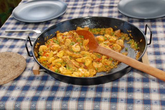 1½ dl løse ris ( man kan købe rigtige paella ris, men alm parboilled eller naturris, kan nu også sagtens bruges)