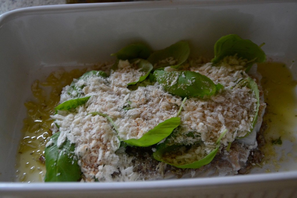 kom resten af sardinmosen oven på torskestykkerne og drys rosmarin over.