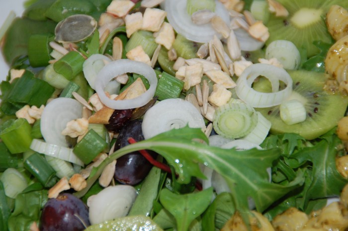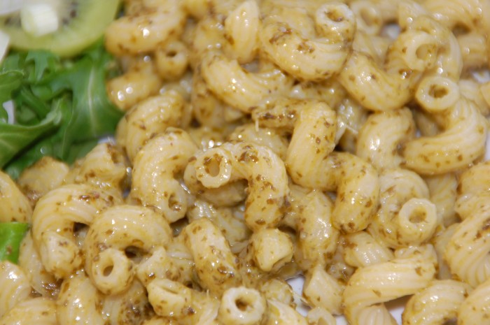 Vi gad ikke det helt store den dag, så de blev blot serveret med en omgang kogte pasta skruer, vendt i pesto, og selvfølgelig lidt salat, blev der også plads til